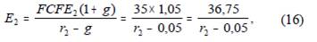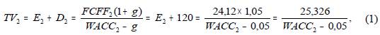где Е2 - стоимость собственного капитала в конце второго года, D2 - сумма процентных обязательств во втором году, FCFF2 - денежный поток на инвестированный капитал во втором году, g - ожидаемый темп роста денежных потоков (FCFF) в постпрогнозном периоде, WACC2 - WACC во втором году, которая вычисляется следующим образом:
