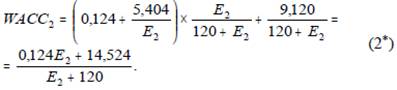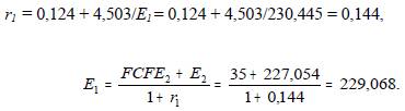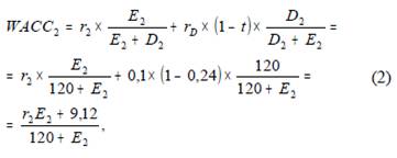Подставляя последовательно значение β2 из (4) в (3), значение r2 из (3) в (2) и значение WACC2 из (2) в (1), оценим стоимость собственного капитала в конце второго года. Осуществим эти расчеты, подставляя сразу (4) в (3):
