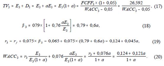 Такое несовпадение обусловлено, прежде всего, тем, что применяя формулу (16), мы нарушили одно из сделанных ранее допущений, а именно: «начиная с второго года, структура капитала компании будет неизменной». Если мы в начальных допущениях предполагали рост денежных потоков, начиная со второго года, на 5% ежегодно, то следует оговориться, рост каких именно денежных потоков подразумевался. В нашем случае мы неявно подразумевали в качестве основного прогноз потоков на инвестированный капитал (первая строка таблицы 1), а прогнозные потоки на собственный капитал были вычислены на основе имеющихся данных о существующих и планируемых процентных обязательствах, и начисляемых по ним ставках. Соответственно, поскольку денежные потоки на собственный капитал имеют функциональную зависимость от потоков на инвестированный капитал, изменения уровня процентной задолженности и процентных платежей, рост потоков на инвестированный капитал на 5% обусловит изменение потоков на собственный капитал в общем случае на иную величину (т. е. не равную 5%). В нашем случае (примере) рост потоков акционеров во втором году с 25 до 35 было обусловлен, прежде всего, ростом привлеченных средств. Можно показать, что при 5% росте потоков на инвестированный капитал с 24,12 во втором году до 25, 326 в третьем году, для обеспечения роста потоков акционеров на эти же 5% потребуется в дополнение к имеющейся процентной задолженности в размере 120 (во втором году) привлечь дополнительно 22, то есть довести общий уровень задолженности до 142. Такое изменение заемных средств нарушит структуру капитала компании (измеренную в рыночных ценах). Для сохранения структуры капитала неизменной требуется, согласно, первоначальным допущениям, чтобы отношение стоимости долга к акционерному капиталу во все годы, начиная с второго, оставалось неизменным, и равным: D2/E2 = 120/227,054 = 0,529 (обозначим для краткости это отношение «а»). С учетом этого условия оценим стоимость инвестированного и акционерного капитала на конец третьего периода: