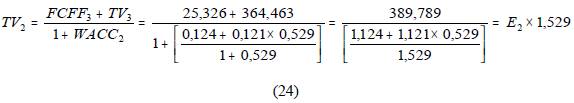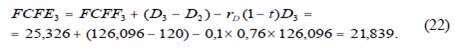 Решением (21) будет: E3 = 238,367, D3 = 0,529 x 238,367 = 126,096, TV3 = 364,463. Поскольку теперь мы знаем «правильный» уровень задолженности в третьем прогнозном году, прогнозируемый в третьем году денежный поток акционеров составит: