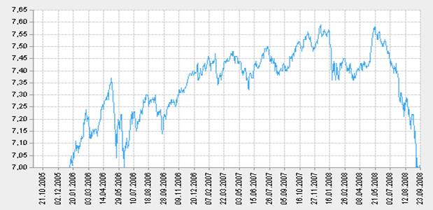 Название "Индекс ММВБ" было учреждено 28 ноября 2002 года. Этот индекс (его динамика приведена на рис.3), который рассчитывается как взвешенный по эффективной капитализации биржевой индекс рынка самых ликвидных акций эмитентов России, разрешенных к обращению в ЗАО "ФБ ММВБ", ведет свое существование с 22 сентября 1997 года и изначально назывался "Сводный фондовый индекс ММВБ".