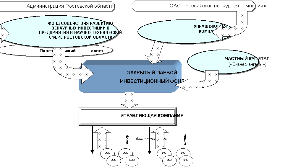 В данном случае речь идет о привлечении федеральных инвестиций в региональный венчурный фонд Ростовской области. Это возможно только на основе использования механизмов государственно-частного партнерства. Их сущность состоит в долевом участии государства в венчурных фондах напрямую или через посредничество «Фонда фондов» ( венчурная компания»), а также в финансовом содействии частным венчурным фондам и инновационным компаниям. В ведении государства может находиться и создание венчурной инфраструктуры: подготовка инновационных менеджеров, организация центров обучения предпринимателей венчурной культуре, поведение венчурных ярмарок.