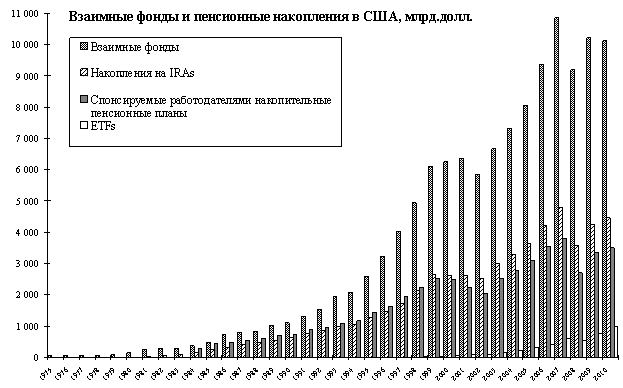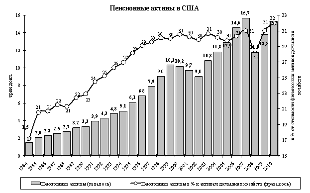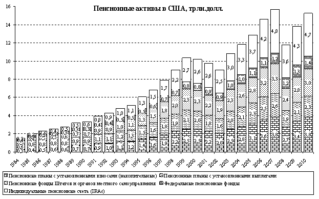 США являются страной, где наиболее развит третий элемент пенсионной системы в виде индивидуальных пенсионных счетов (IRAs), которые физические лица могут открывать в разных финансовых организациях. Основные элементы нынешней пенсионной системы в США начали складываться с начала 1980-х гг. Она включает федеральные пенсионные фонды, пенсионные фонды штатов и органов местного самоуправления, пенсионные планы с установленными выплатами, пенсионные планы с установленными взносами и накопления на индивидуальных пенсионных счетах. За последние 30 лет имел место заметный рост пенсионных активов, несмотря на периодические снижения их стоимости под воздействием финансовых кризисов начала 2000-х гг. и гг. Об этом свидетельствуют данные рис.1.