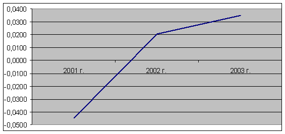 Установлено, что имеет место рост текущей отдачи на собственные средства. Так, в 2001 г. она составила -0,0447 (отрицательное значение показателя обусловлено отрицательным значение чистой прибыли – убытком), в 2002 г. – 0,0207, что на 0,0655 больше предыдущего периода, а в 2003 г. - 0,0351, что еще на 0,0143 (или на 69,15%) больше. При этом темпы роста показателя постепенно замедляются.
