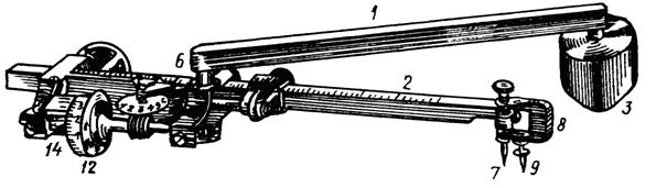Полярный планиметр (рис. 16) состоит из трех частей: полюсного 1 и обводного 2 рычагов и каретки счетного механизма. Полюсный рычаг с одной стороны имеет груз с иглой 3, которая является полюсом планиметра; перед началом измерений иглу вдавливают в бумагу. С другой стороны полюсный рычаг заканчивается шарниром 6, с помощью которого он соединяется с кареткой счетного механизма. На конце обводного рычага имеется обводный шпиль 7, которым обводят контур участка, удерживая рычаг за ручку 8. Для того чтобы шпиль не царапал карту, существует штифт 9, длину которого можно регулировать с помощью гайки. В более поздней конструкции планиметра шпиль заменен увеличительным стеклом с точкой в центре. На обводном рычаге расположена каретка со счетным механизмом (рис. 17). Он состоит из счетного колеса 12, счетчика целых оборотов счетного колеса 13 и верньера 14. При измерении площади участка ободок счетного колеса 15 и ролик 16 должны находиться в пределах листа карты.