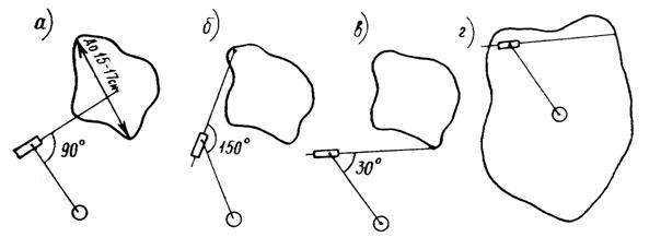 Измерение площадей относительно небольших участков (в поперечнике не более 15–17 см) производится с полюсом вне контура. Так же, как и при определении с, шпиль располагают примерно в центре участка, а для полюса выбирают такое место, чтобы рычаги планиметра составляли прямой угол (рис. 18, a). Затем производится беглый обвод контура. Угол между рычагами (рис. 18, б,в) должен составлять не менее 30° и не более 150°. Если это условие не выполняется, то подбирается другое, более благоприятное положение полюса. Возможны случаи, когда это не удается, и угол между рычагами выходит за пределы допуска при любом положении полюса. Тогда измерение площадей следует выполнять с полюсом внутри контура (рис. 18, г) или по частям.