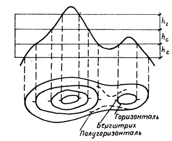 Для изображения отдельных деталей рельефа применяют полугоризонтали, в том случае, если это не удается сделать при помощи основных горизонталей. Их проводят через hc/2, вычерчивают прерывистыми линиями (см. рис. 21).