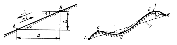 Все формы рельефа образуются из сочетания наклонных поверхностей – скатов. Крутизна ската оценивается или углом наклона (в градусной мере), или величиной уклона i. Уклоном линии называется тангенс угла наклона линии к горизонту: i = tg n = h/d (рис. 24), где h – превышение; d – горизонтальное проложение линии. Угол наклона линии и уклон линии могут быть положительными (+n; +i) или отрицательными (–n; –i).