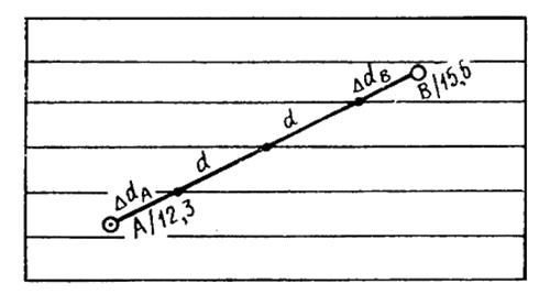 При съемке рельефа характерные точки (А, В или ACD и т. д.) выбирают там, где уклон ската меняет величину или направление. Чем меньше hc (чем крупнее масштаб), тем больше требуется принимать характерных точек рельефа. После нанесения характерных точек с известными отметками на лист бумаги отыскание местоположения точек, принадлежащих определенной горизонтали, производят интерполированием: аналитически, графически или на глаз. При любом способе интерполирования необходимо определить величину трех различных отрезков (рис. 26): DdA; d; DdB. Пусть имеем на плане две соседние точки А и В. Их отметки таковы, что при данной hc между этими точками пройдут три горизонтали с отметками H1, H2, H3.