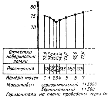 На карте наносится профильная линия (линия СD на рис. 29), по которой требуется составить профиль местности. При составлении профиля выписывают расстояния между характерными точками и их отметки (рис. 30). Характерные точки находятся в местах пересечения профильной линии горизонталями (точки 1, 2, 4, 5 ... на рис. 29), водораздельными и водосливными линиями (точки 3, 13 – там, где уклон меняет знак).