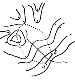 Под водосборной площадью понимается та часть земной поверхности, с которой вода стекает к данному сечению водотока. Границы водосборной площади определятся водораздельными линиями. Пусть, например, в определенной точке водотока намечен створ водо-пропускного сооружения (рис. 31). От точек a и b граница водосборной площади пойдет перпендикулярно к ближайшим горизонталям и далее по водораздельным линиям.