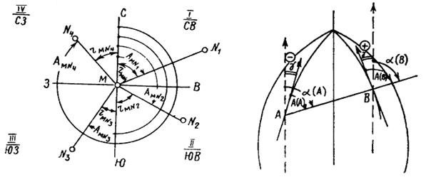 На рис. 39,а показан географический азимут для линии ВС (пунктирная линия – направление географического меридиана в точке В).