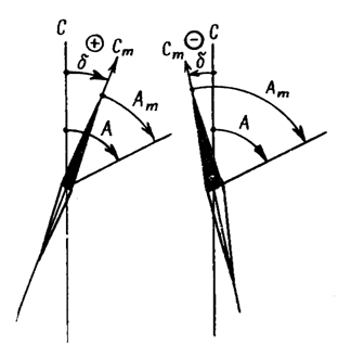 Магнитный меридиан, как правило, не совпадает с географическим. Угол, образованный этими меридианами, называется магнитным склонением d (см. рис. 44). Приписывая восточному склонению знак плюс, а западному минус, во всех случаях получаем: А = Ат + d.
