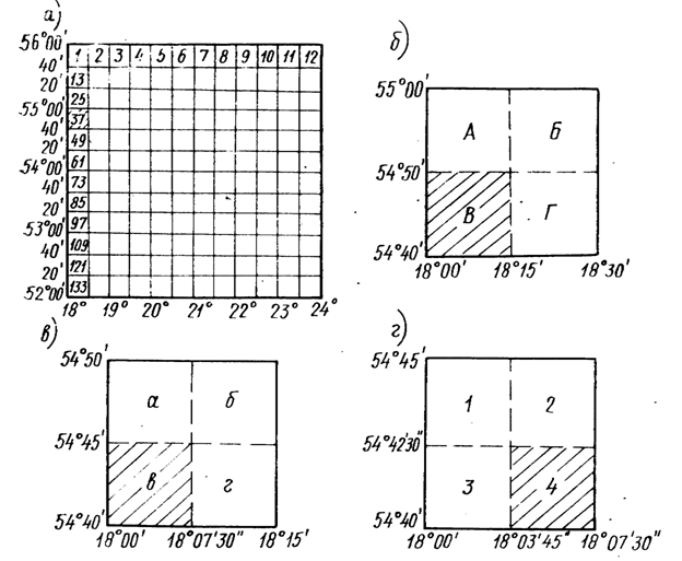 Листу плана масштаба 1:5000 соответствуют 4 листа в масштабе 1:2000, обозначаемые прописными буквами русского алфавита. Лист плана в масштабе 1:2000 делится на 4 листа планов масштаба 1:1000, обозначаемых римскими цифрами (рис. 49, а), и 16 листов планов масштаба 1:500, обозначаемых арабскими цифрами (рис. 49, б). Так, заштрихованный на рис. 49, а лист Г масштаба 1:2000 будет иметь номер 1-Г. Там же – лист масштаба 1:1000, заштрихованный двойной штриховкой и обозначенный римской цифрой I, имеет номер 1-Г-I. Номер листа карты масштаба 1:500, заштрихованного на рис. 49, б, – 1-Г-6.