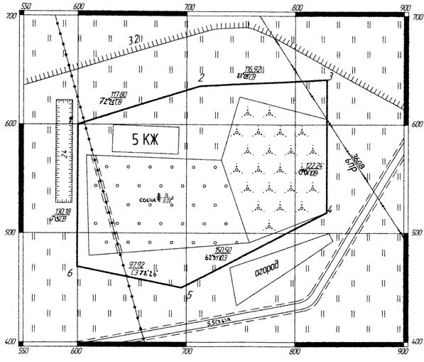 После вычерчивания контуров оформление плана производится в точном соответствии с обязательными условными знаками, т. е. на план наносят в карандаше условные знаки с соблюдением их размеров и начертания согласно действующим «Условным знакам для планов масштаба 1:5000; 1:2000; 1:1000; 1:500».