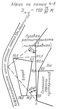 Построение контуров местности на плане производят по абрисам (см. рис. 53 58). Способ вычерчивания контуров определяется способом съемки, при этом применяют геодезический транспортир, поперечный масштаб линейку и выверенный прямоугольный треугольник.
