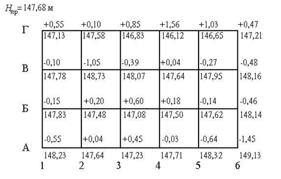Рабочие отметки всех вершин квадратов получаются как разности проектной отметки