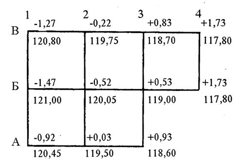 Для упрощения вычислений удобно выделить наименьшую из четырех отметок вершин квадратов с округлением до дециметра и производить арифметические действия с остающимися дополнениями до соответствующей черной отметки. В данном случае