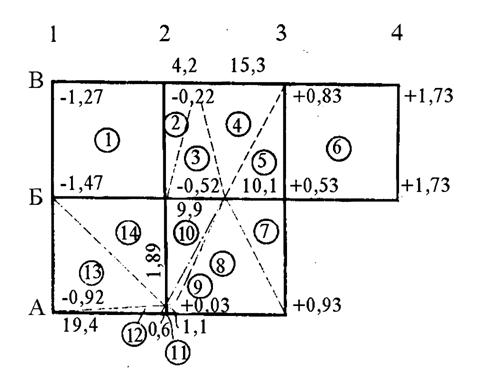 и зафиксировать их в вершинах квадратов. Так, в вершине А1 это 0,55, в вершине А2 +0,04, в А3 +0,45 и т. д.