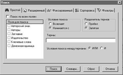 Внимание! При выполнении поиска по словарям не учитываются установленные параметры фильтра и сортировки. Чтобы поиск происходил с учетом этих установок, необходимо после отбора всех термов нажать кнопку Поиск..., после чего система переключится в режим расширенного поиска с уже сформированным запросом. В расширенном поиске выполняется запрос с учетом установок в режимах Фильтр и Сортировка.