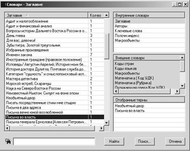 Система позволяет осуществлять поиск по текущему словарю. Для этого надо в строке ввода, расположенной ниже окна списка термов, ввести начальные буквы терма, который необходимо найти. В этом случае на экран будут выдаваться значения словаря, которые по алфавиту больше или равны введенному. Если ввести первым символ ‘*’, то будет осуществляться контекстный поиск, т. е. будут выдаваться только те значения словаря, которые содержат внутри себя введенный терм. Поиск осуществляется по значениям текущей колонки, т. е. по колонке, по которой происходит сортировка.