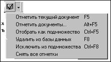 В отобранном подмножестве с помощью кнопки панели инструментов "Отметить текущий документ" (клавиши <F5>) или "Отметить документы" (клавиши <Alt-F5>) отмечаются один документ или последовательное подмножество документов, над которыми впоследствии могут быть произведены следующие действия: