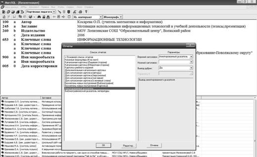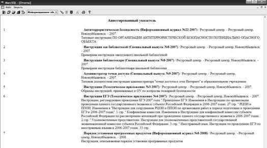 На экране появится список отчетов, из которых выбирается требуемый. С помощью этого режима можно получить Бюллетень новых поступлений, Аннотированный указатель, Библиографический указатель и др. (в категории «+ Стандартные выходные формы»). Созданные отчеты выдаются на экран для просмотра и печати (см. рисунок 9, рисунок 10). При необходимости отчеты можно загрузить в Word или в Excel для дальнейшего редактирования, выполнив команду Файл/Вызов редактора/Word (Excel) в окне «Отчеты».
