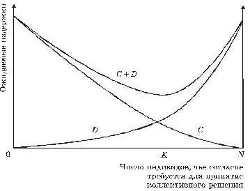 По вертикальной оси откладываются издержки принятия коллективного решения, а количество людей от 0 до N, чье согласие необходимо для решения проблемы, откладывается на горизонтальной оси.