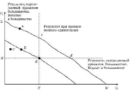 Вертикальная и горизонтальная оси представляют ординамистские функции полезности для богатых и бедных. Все члены каждой группы имеют идентичные предпочтения. Первоначальная ситуация (производятся только частные блага) характеризуется точкой Е. Производство общественных благ увеличивает полезности индивидов обоих групп, что выражается в виде смещения границы благосостояния по Парето в положение XYZW. В условиях полного единогласия обе группы индивидов должны оказаться богаче благодаря наличию общественных благ, а значит голосовать за их производство. Поэтому для случая полного единогласия конечный результат должен характеризоваться точкой, находящейся на участке YZ границы благосостояния по Парето.