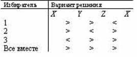 Рассмотрим трех избирателей, у каждого из которых имеются свои предпочтения относительно трех вариантов решения какого-либо вопроса (знак > указывает на направление предпочтений). X предпочтительнее, чем Y, Y предпочтительнее Z, а Z отдается предпочтение перед X. Голосование в данном случае превращается в бесконечный цикл. Правило большинства не может определить победителя, если не прибегать к произволу.
