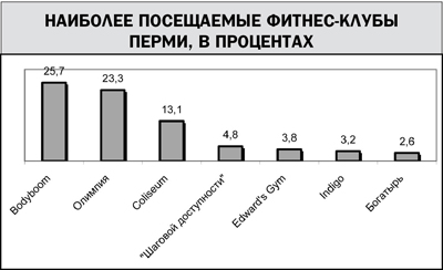 В рамках исследования респонденты отметили еще несколько клубов: 3,8 % жителей предпочитают сеть фитнес-клубов Edward’s Gim, 3,2 % посещают клуб Indigo, а 2,6 % – «Богатырь». Остальные фитнес-заведения не отметил никто из опрошенных. Учитывая ошибку выборки, оставшиеся клубы Перми могли посещать хоть раз до 3 % горожан.