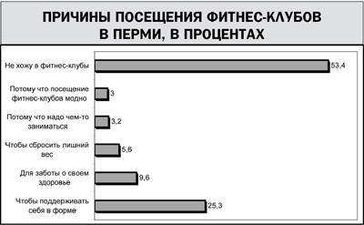 При этом в основном так думают мужчины (28,1 %) и молодые люди в возрасте от 18 до 30 лет (49,1 %). Каждый десятый житель Перми полагает, что посещение фитнес-клуба просто полезно для здоровья. Еще 5,6 % горожан, принимая решение о походах в фитнес-клуб, руководствуются при этом необходимостью сбросить лишний вес. А наименьшее число пермяков назвали следующие причины посещения фитнес-клубов: 3,2 % ходят туда просто потому, что им больше нечем заняться, а 3 % отдают дань моде.