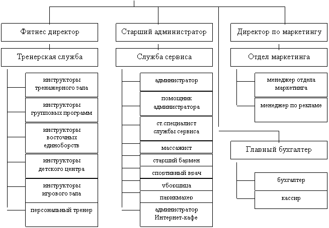 Руководит клубом генеральный директор. В его непосредственном подчинении находятся фитнес директор, старший администратор, директор по маркетингу и главный бухгалтер.