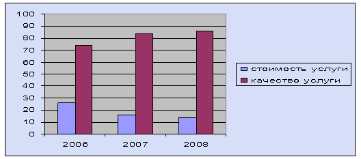 Из данного рисунка видно, что из всех абонентов, отказавшихся от услуг АФ Телеком», в 2006 году более 70 % недовольны качеством услуги кабельного телевидения, а в 2008 году около 90 %. А также небольшое количество абонентов не устраивает стоимость услуги.