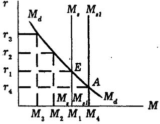 Помимо предпочтения ликвидности норму процента определяет количество денег. Предположим, что центральный банк увеличил предложение денег с MsMs до Ms1Ms1 (рис. 1). Тогда равновесие на денежном рынке достигается в точке А на пересечении кривой спроса на деньги МdМd с кривой предложения при уровне ставки процента г4. Уменьшение предложения денег центральным банком до МsМs вернет ставку процента к уровню г1.