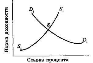 Рассмотренные нами представления о природе процента на капитал, положены в основу неоклассической теории процента (иное название –реальная теория процента). Согласно этой теории убежденность людей в производительном характере капитальных благ и присущая им склонность предпочитать настоящее потребление будущему в результате обусловливают существование надбавки к цене на сегодняшние блага по сравнению с будущими благами, и тем самым приводят к положительной ставке процента во всех известных обществах. Равновесная ставка процента в условиях совершенной конкуренции складывается на рынке капитала в процессе сравнения полезности капитала - предельной доходности на капитал и альтернативных издержек на капитал – издержек, связанных с отказом использования капитальных благ в настоящее время в обмен на будущее. Пересечение кривых инвестиционного спроса и предложения определяет точку равновесия предельной эффективности капитала и ставки процента. Рис. 2 показывает, что оно достигается в точке Е.