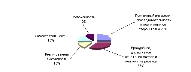 - определенные личностные особенности матерей (депрессия, низкая самооценка, жертвенность, нарциссизм, импульсивность, нестабильность идентификации), которые через механизм идентификации приводят к формированию характерного стиля личностного реагирования ребенка.