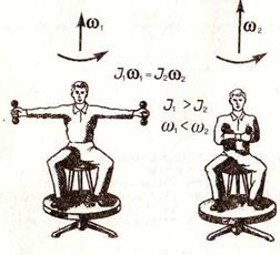 где J0 - момент инерции скамьи с человеком, m - масса одной гантели, r1 - расстояние гантели до оси в первом случае, r2 - расстояние гантели до оси во втором случае.