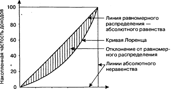 Очевидно, в конкретных случаях нельзя ожидать ни абсолютного равенства, ни абсолютного неравенства в распределении доходов среди населения. Абсолютное неравенство — тот гипотетический случай, когда все население, за исключением одного человека (одной семьи), не имеет доходов, а этот один (одна семья) получает весь доход.