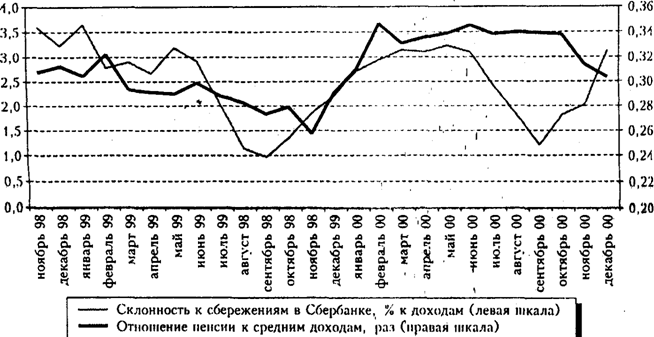 Общая склонность к сбережению под влиянием перечисленных факторов в 2000 г. достигла 6%, что вдвое меньше, чем в 1997 г. Этого в нынешних условиях недостаточно для того, чтобы величина накопленных сбережений. росла по отношению к среднемесячным доходам.