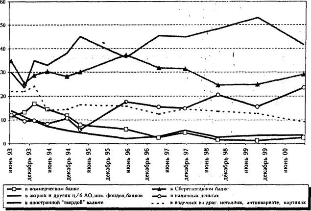 В 2000 г. ситуация в некоторой степени переломилась. Впервые с конца 1995 г. снизилась популярность такой формы хранения денежных средств, как наличная валюта: с 53 до 42%. Одновременно возросла доля людей, отдающих предпочтение наличном рублям: с 16 до 24%. Это связано, по-видимому, с тем, что валютный курс рубля оставался в течение последнего года достаточно стабильным. Несколько увеличилось число людей, готовых положить деньги/на депозитный вклад в Сбербанке (с 25 до 29%) или коммерческом банке (с 1,4 до 2,6%).