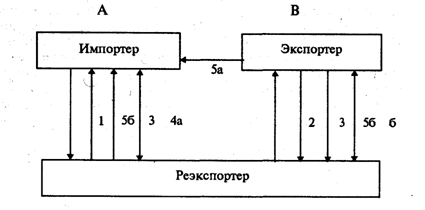 Контрагент из страны Б одновременно действует как экспортер по отношению к контрагенту из страны А и как импортер по отношению к контрагенту в стране В, выступая в этой операции реэкспортером.