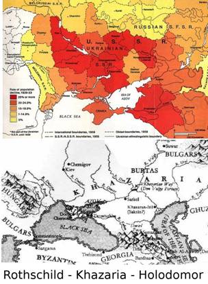 При проведении сравнительного исследования карты голодомора 30-х с картой Хазарии того периода, мы обнаруживаем явное совпадение, что позволяет сделать категорический вывод об умышленном истреблении населения на указанных территориях как посредством голодоморов, так и с помощью депортаций и других репрессий (см. рис. 2, 3).