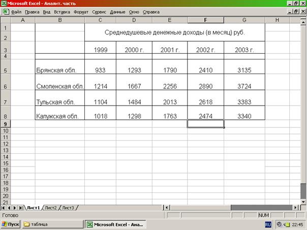 1. За данный период денежные доходы в Брянской обл. возросли на 2202 руб., в Смоленской обл. на 2510 руб., В Тульской обл. на 2279 руб. и в Калужской обл. на 2322 руб.