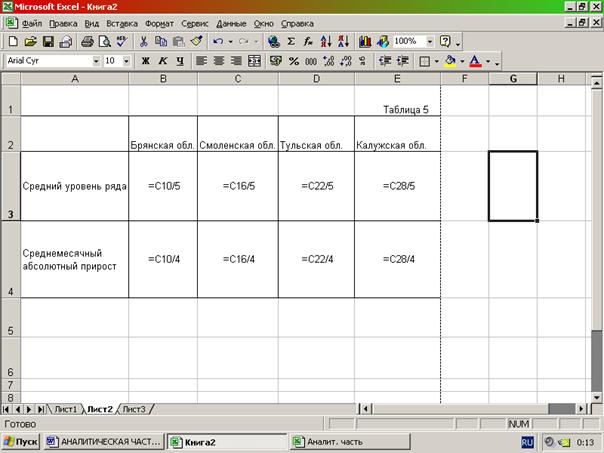 Расположение расчетных формул (6) – (7) (в формате Excel) представлено в таблице 5.