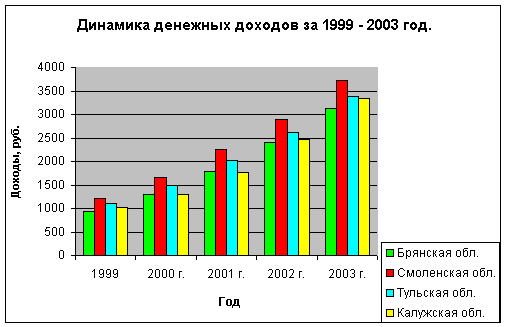 На рис. 1 представлено графическое изображение динамики денежных доходов Брянской, Смоленской, Тульской и Калужской областей за 1999 – 2003 год.