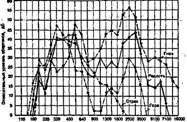 Рис. 5. Интегральные спектры голоса Ф. Шаляпина при исполнении им отрывков из вокальных произведений, насыщенных различным эмоциональным содержанием, показывают сильные различия в уровне и частотном положении высоких обертонов голоса при выражении радости, горя, гнева, страха. Эти различия и обуславливают характерные изменения тембра голоса артиста при выражении эмоций.