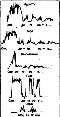 Рис. 6. Осциллограммы голоса, т. е. графическое изображение динамики звука во времени, показывают, что каждая эмоциональная интонация - радость, горе, безразличие, гнев, страх - выражается своими особыми, характерными для нее акустическими средствами (по Морозов, 1989).
