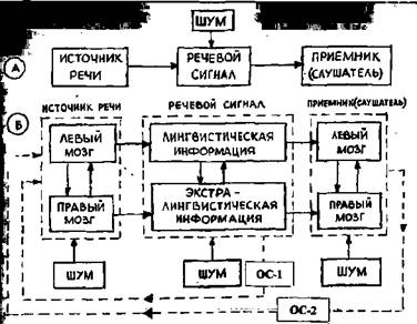 Вместе с тем между вербальным и невербальными каналами имеет место теснейшее взаимодействие и взаимовлияние, что на схеме отмечено вертикальными стрелками. Например, радушные слова, произнесенные язвительным тоном, теряют радушный смысл. Две категории обратных связей (ОС) на схеме обозначают: ОС-1 — систему собственно сенсорного самоконтроля говорящим процессов образования его речи, и ОС-2 — контроля говорящим результатов воздействия его речи на слушателя.