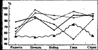 Важнейшая особенность кодирования невербальной информации речи состоит во взаимодействии различных акустических средств, иными словами, любой вид невербальной информации передается, как правило, не каким-либо одним акустическим средством, а одновременно несколькими. Например, информация о разном эмоциональном состоянии говорящего найдет выражение не только в изменении тембра (т. е. спектра) голоса, но и в характерных для каждой эмоции изменениях высоты, силы, темпо-ритмических характеристик речевой фразы (см. рис. 6).